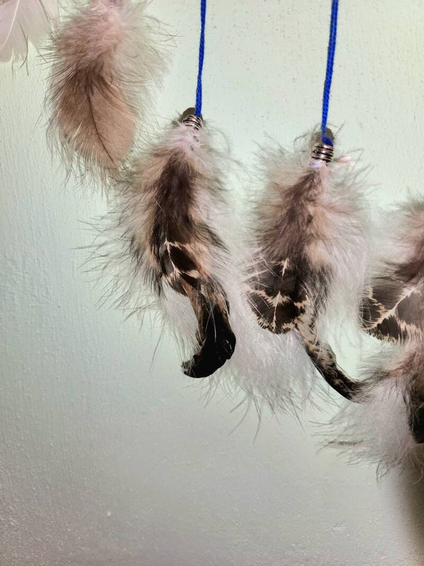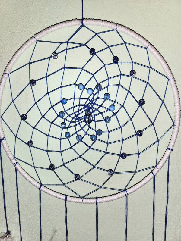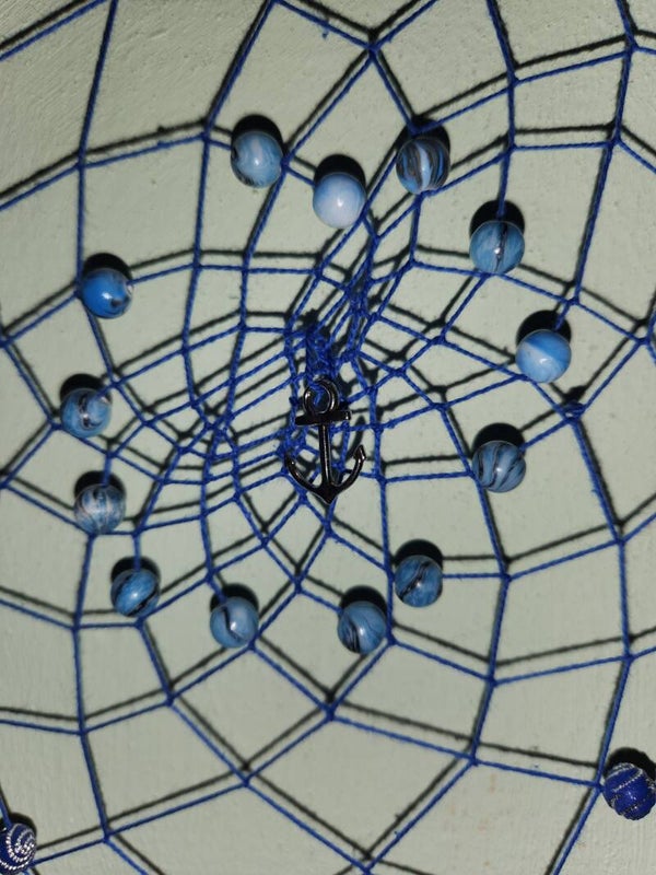 54 x 25 cm großer Traumfänger in blau mit weißem Rand. Je 13 Blaue Edelstein- und Glitzerperlen sind eingearbeitet. In der Mitte befindet sich ein kleiner silberfarbener Anker aus Metall. Die bunten, ungefärbten und unbehandelten Federn unserer Gartenhühner vervollständigen diesen Traumfänger. Die Federn werden mit 8 siberfarbenen Spiralperlen gehalten. Machen Sie Ihren Liebsten eine Freude mit diesem außergewöhnlichen Geschenk.