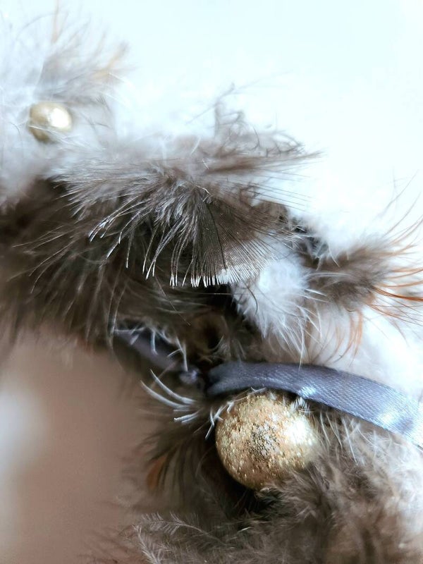 Ein flauschiger Türkranz aus Daunen von unseren Gartenhühnern in weiß/grau. Der Kranz selbst besteht aus einem weißen Holzkranz, die Federn sind einzeln per Hand aufgeklebt. Es sind kleine goldglitzernde Kugeln eingearbeitet. Er ist auch als Deko für den Tisch, z.B. in Verbindung mit einer Stumpenkerze gut zu verwenden. Lassen Sie Ihrer Fantasie freien Lauf.de