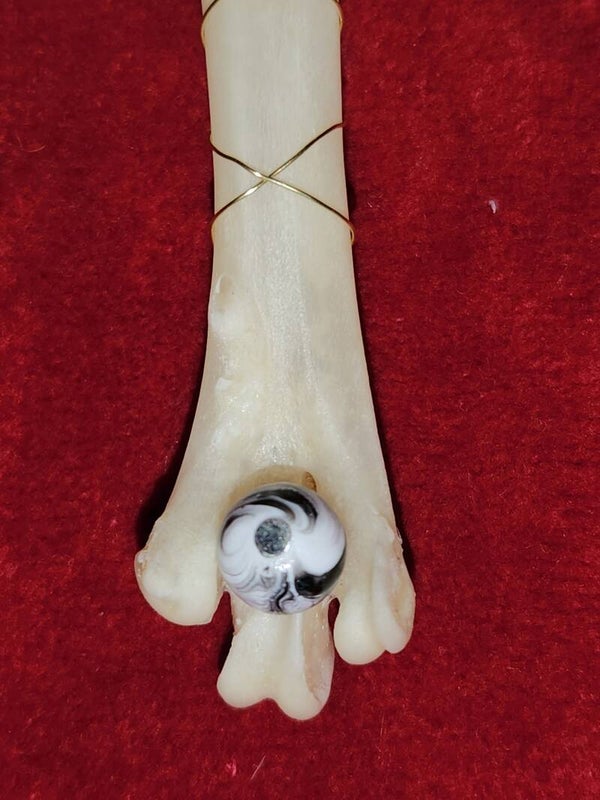 Kleiner Fächer 18 x 10 cm aus Hühnerfedern mit einem Griff aus einem Hühnerknochen. Er kann als Räucherfächer oder einfach als Deko verwendet werden. Der Griff ist mit einem Lederband, Perlen und goldfarbenem Draht verziert. Ein absolutes Unikat, das viel Freude machen wird.