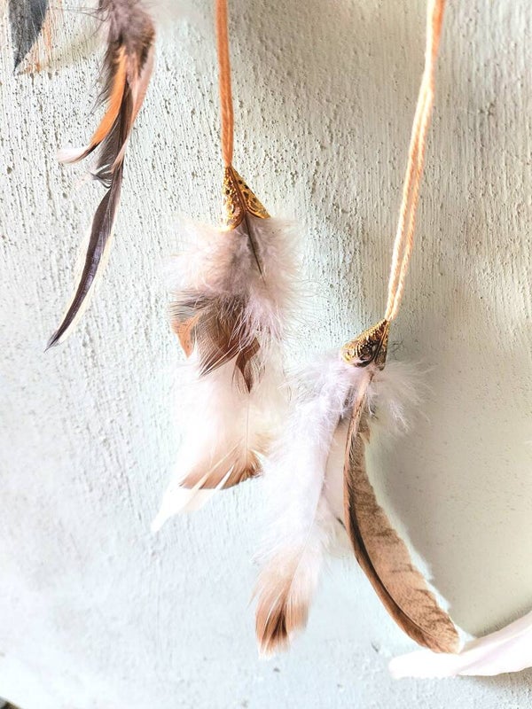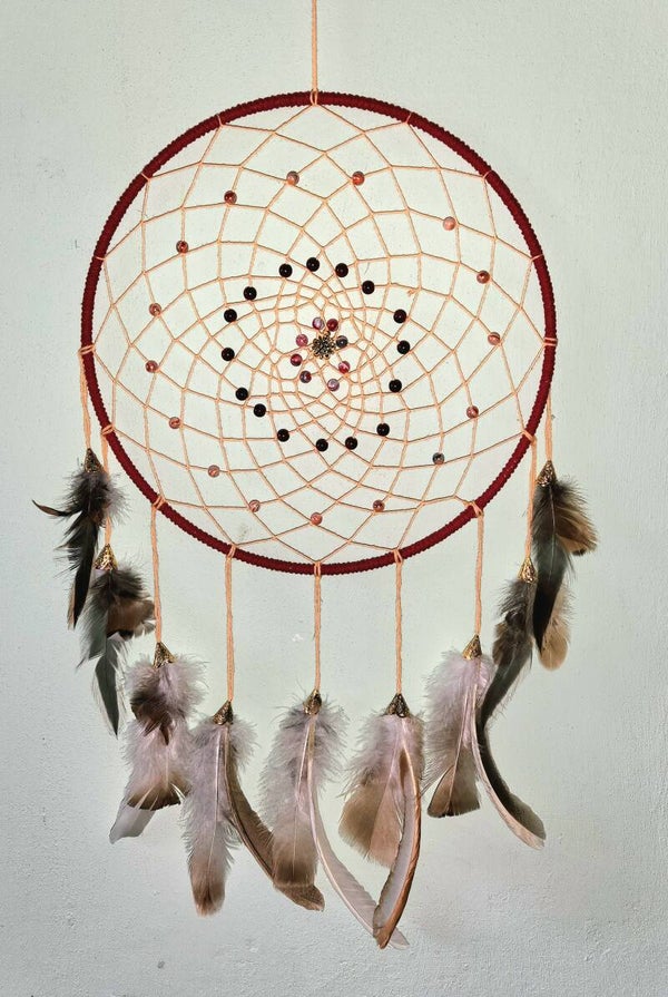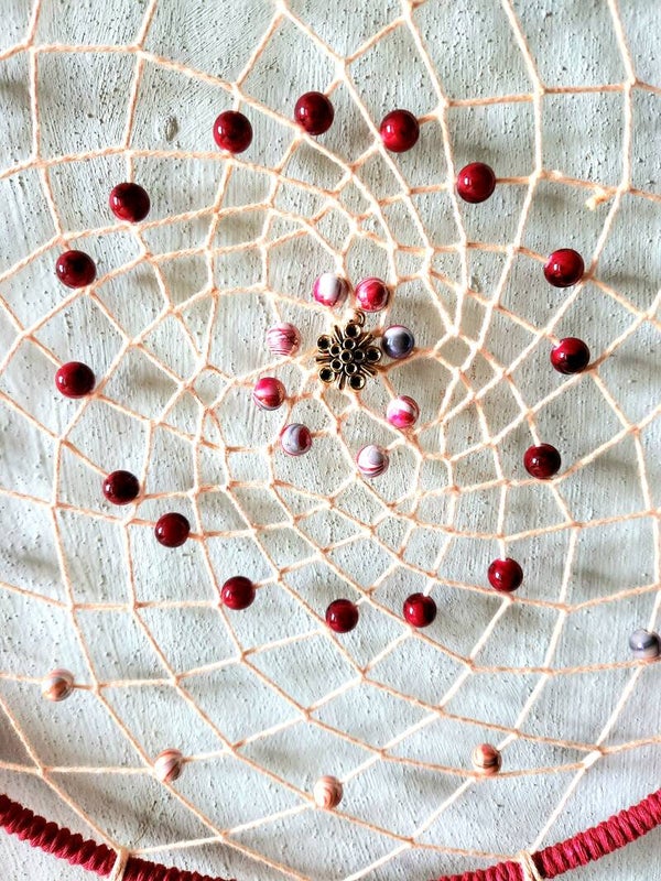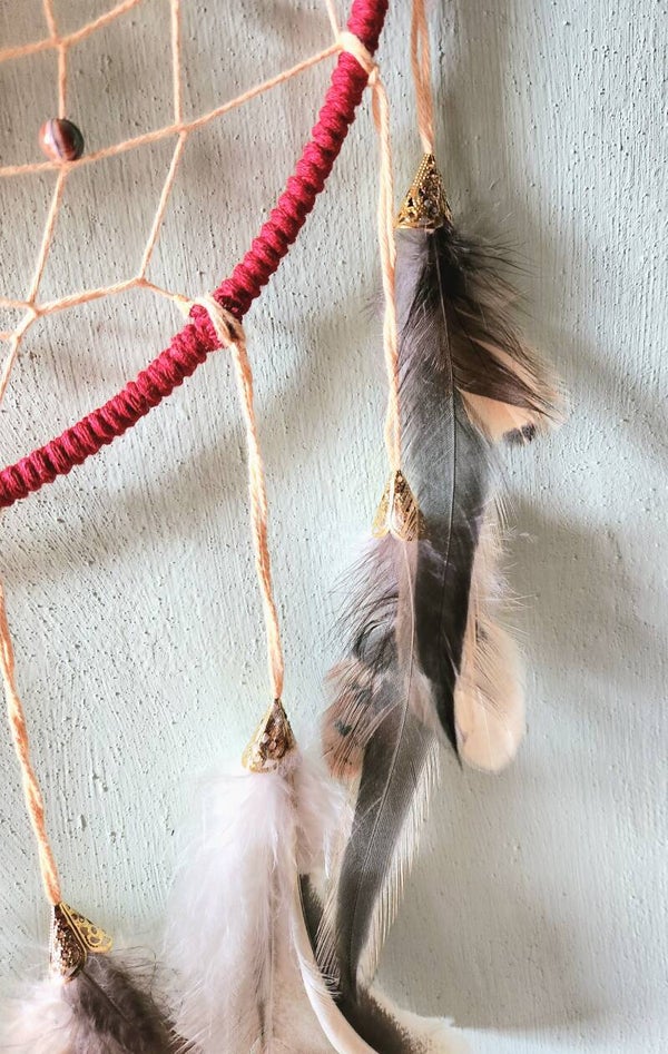 30 x 61 cm großer Traumfänger in wunderschönem, warmen rot mit rosa/aprikot-farbenem Netz. Rote und rot-bunte Perlen sind um ein Blumenornament eingearbeitet. Die bunten ungefärbten und unbehandelten Federn unserer Gartenhühner vervollständigen diesen Traumfänger. Machen Sie Ihren Liebsten eine Freude mit diesem außergewöhnlichen Geschenk.