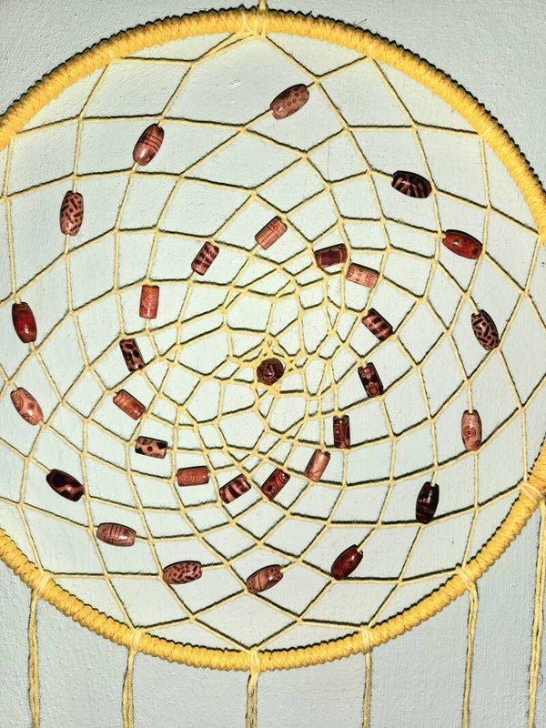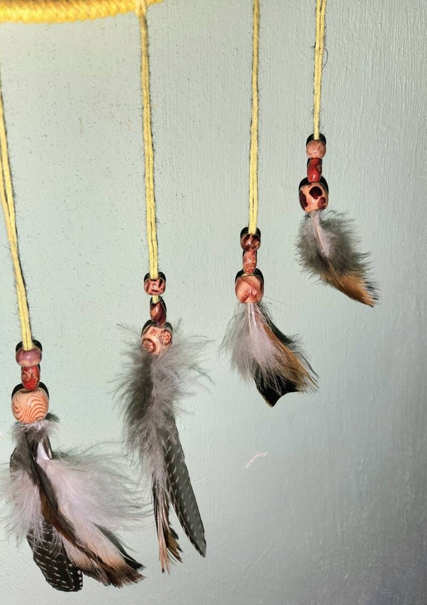 50 x 25 cm großer Traumfänger in gelb. 52 Holzperlen sind eingearbeitet. Die bunten ungefärbten und unbehandelten Federn unserer Gartenhühner vervollständigen diesen Traumfänger. Machen Sie Ihren Liebsten eine Freude mit diesem außergewöhnlichen Geschenk.
