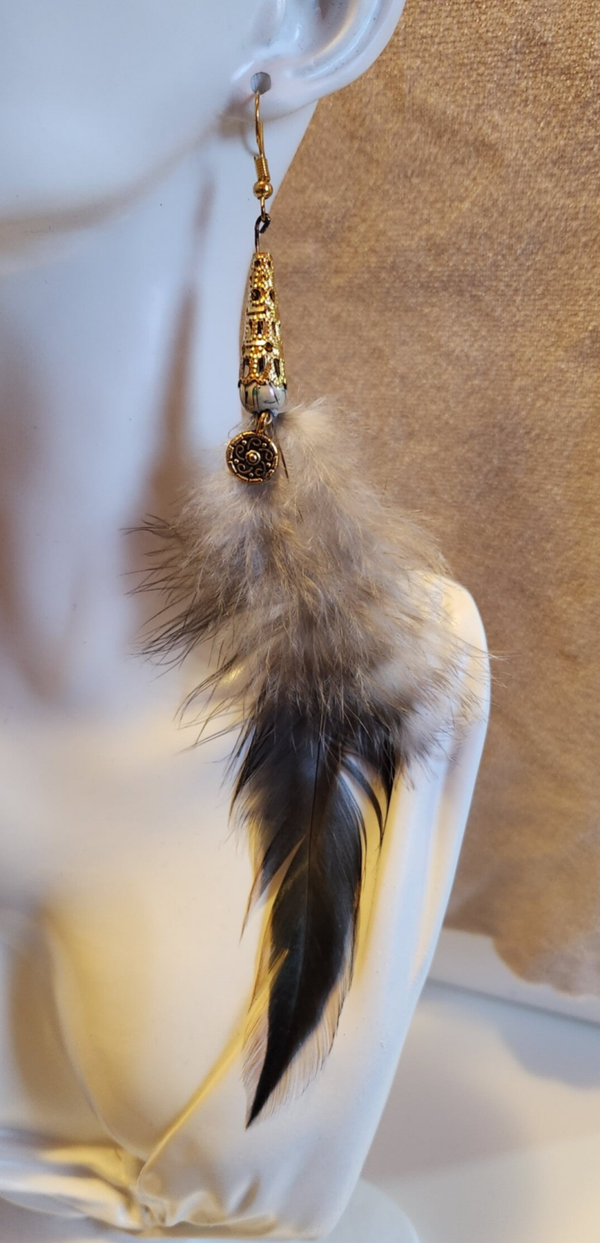 Federohrring aus Daune und Halsfedern mit goldfarbener Applikation